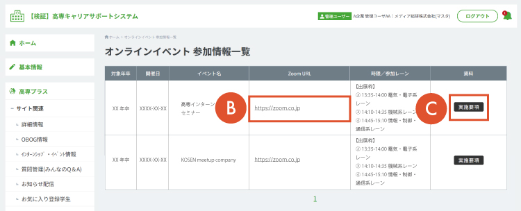 対象年卒・開催日・イベント名・ZoomURL・出展枠・実施要項など