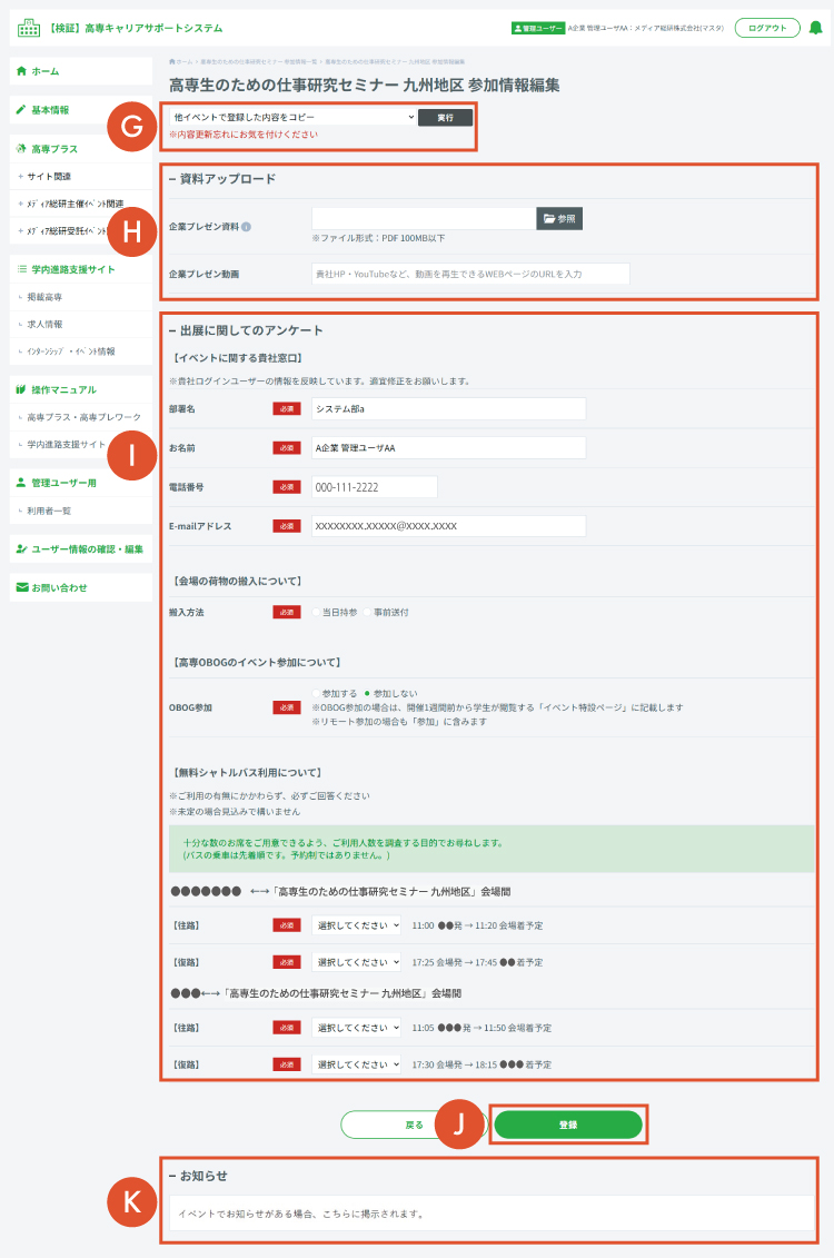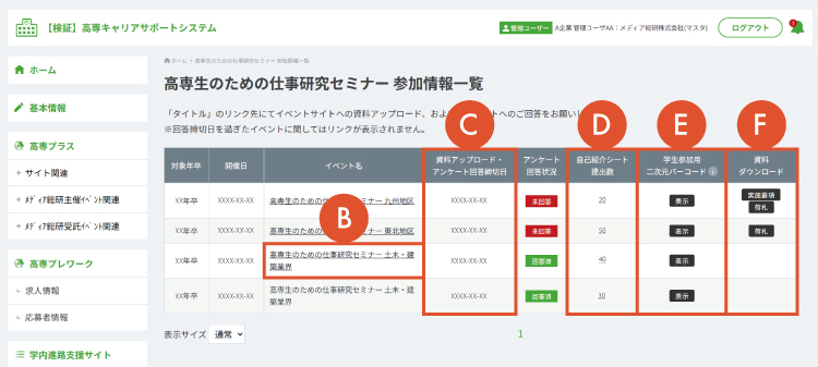 イベント特設ページに掲載する資料の設定や、自己紹介シートを提出した学生の個人情報ダウンロードなどが行えます。