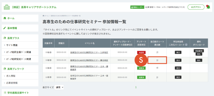 提出された自己紹介シートは高専キャリアサポートシステムで閲覧・ダウンロードが可能です【管理ユーザー限定】。