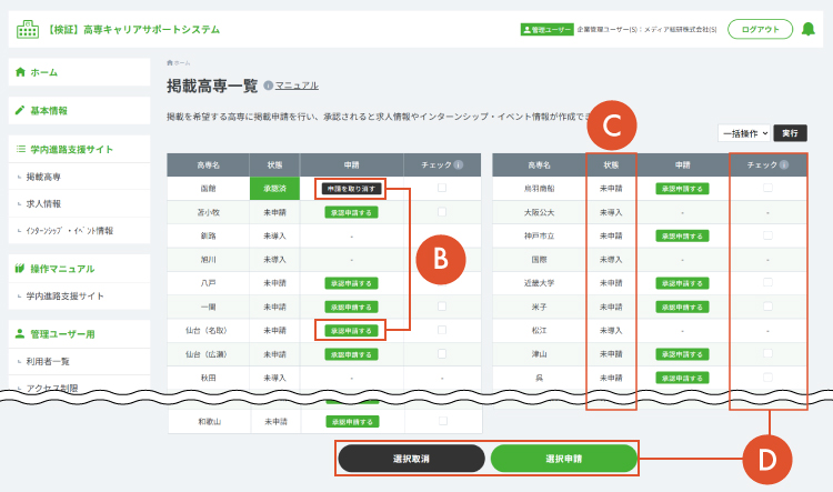 ※「未導入」は学内進路支援サイトを導入していない高専です。 - チェックを入れて、一括で申請・取り消しを行います。