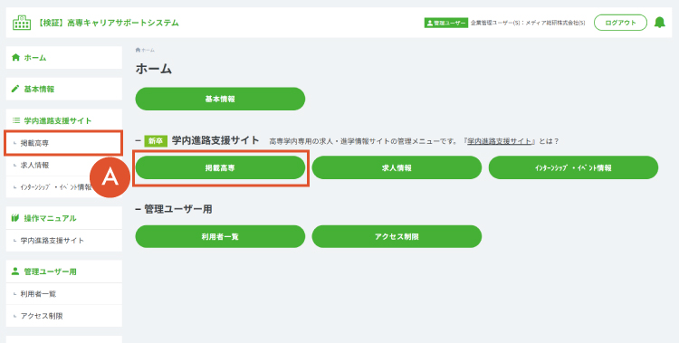 - 高専キャリアサポートシステム ホーム画面の「掲載高専」をクリックします。
